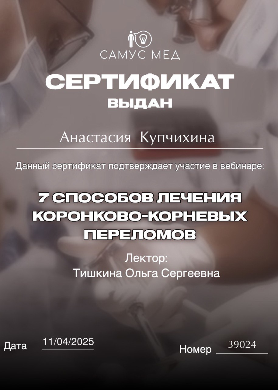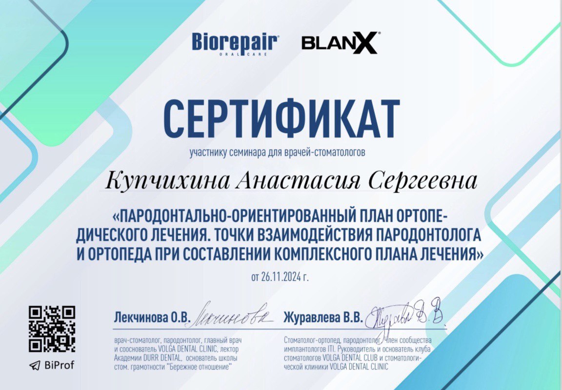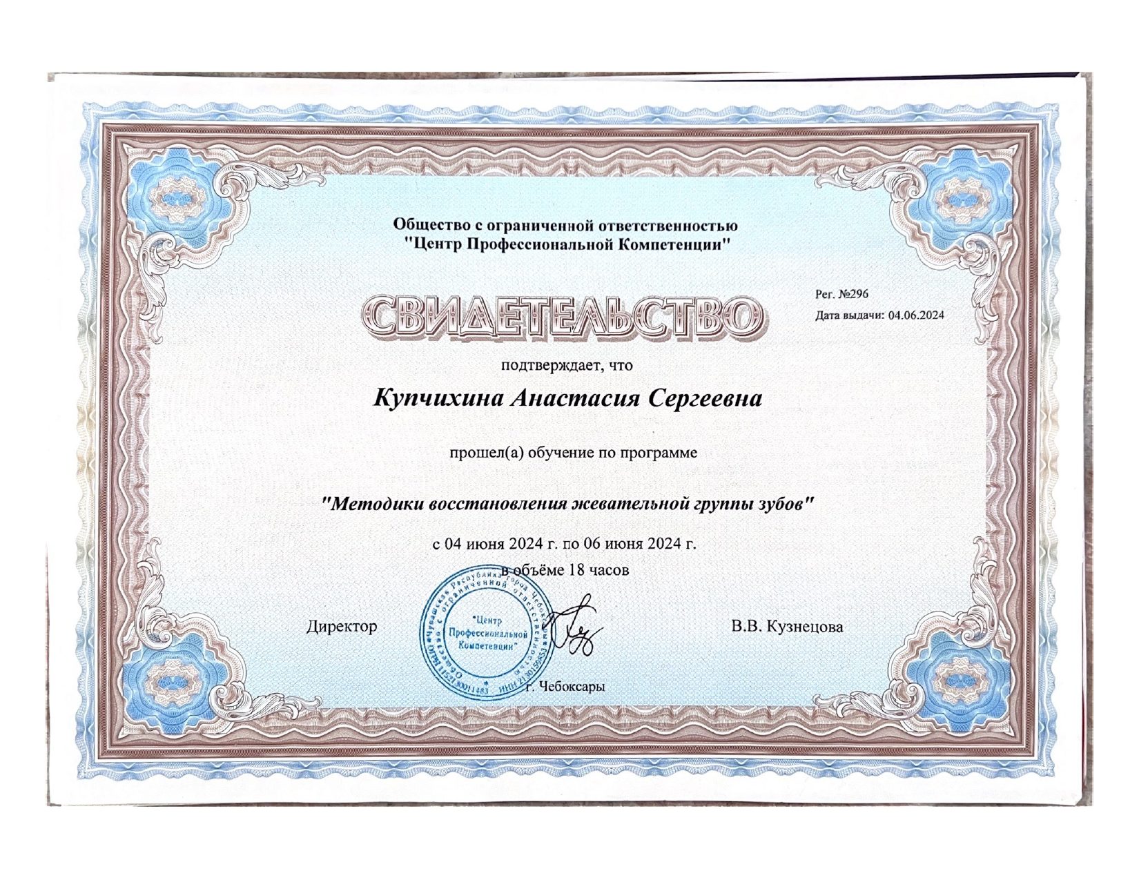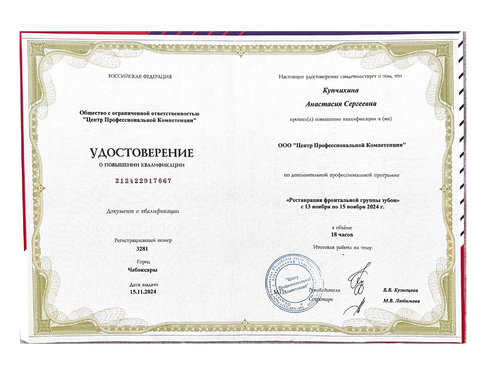 С 2024г. и по настоящее время прохождение ординатуры на базе Чувашского Государственного Университета им.И.Н.Ульянова, направление специальности «ортопедическая стоматология»
